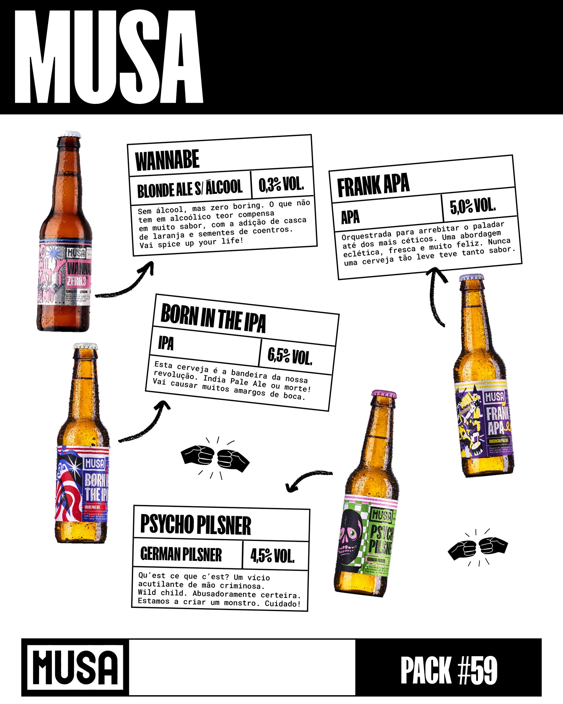 Ale My Friends is also a club to which you can subscribe to receive a selection of our brewers' beers at your home every month, with free delivery and a 10% discount. Club subscribers are also entitled to a welcome pack, complete with a t-shirt, a tasting guide, an Ale My Friends glass and a Subscriber Card with discounts at Musa bars and the online store. 🤜 🤛