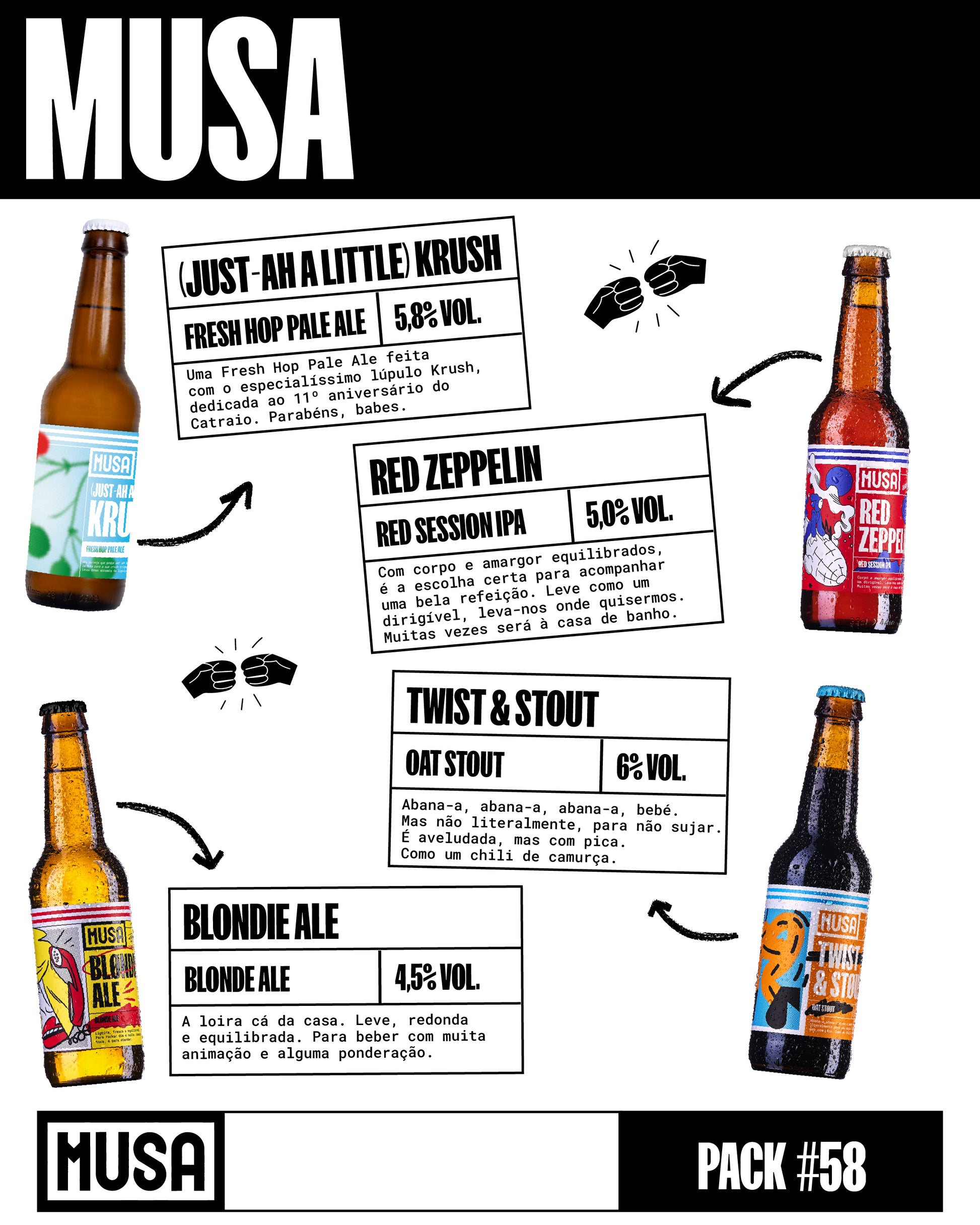 Um pack que conta 12 cervejas feitas por nós e por gente que gostamos muito. Uma selecção desenhada pelos nossos cervejeiros, que prometem os lotes mais frescos, as novidades mais arejadas e os cervejeiros mais bonitos do mercado.